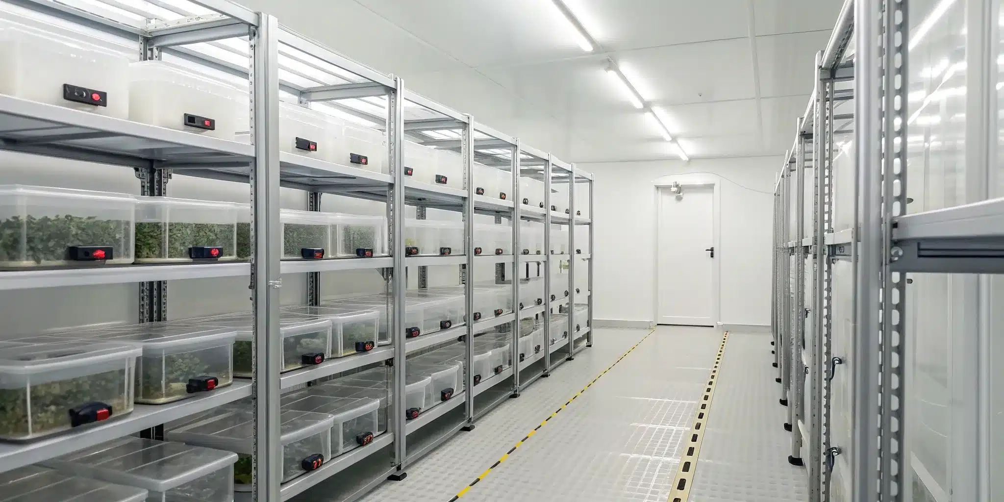 Data loggers tracking temperatures for pharma cold chain monitoring in a climate-controlled storage unit.